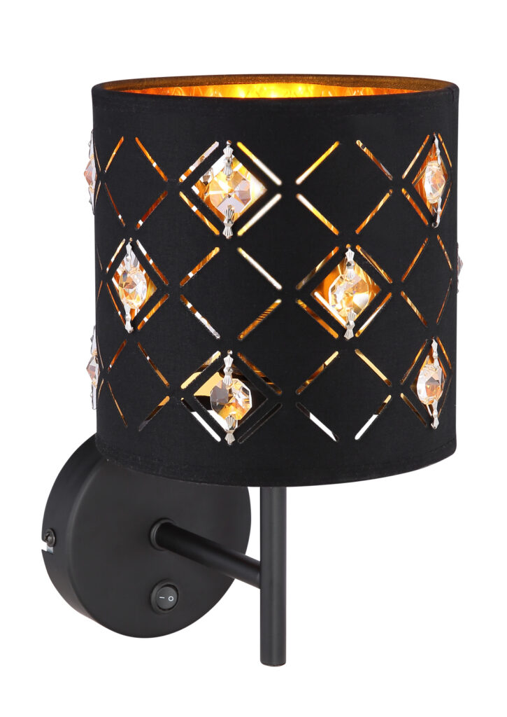 Falikar matt fekete fém váz, textil ernyő fekete-arany színben, akril kristály dekorral