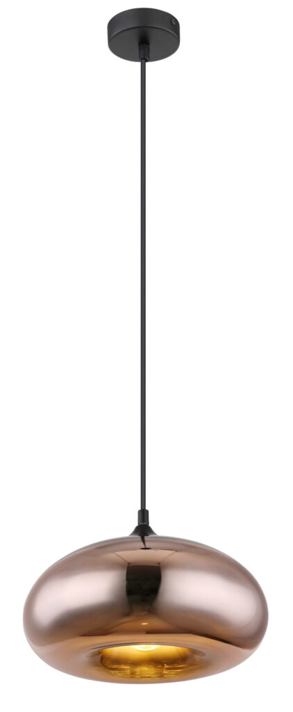 Függeszték fekete fém mennyezetrózsa, üveg búra réz színben. O:280, m