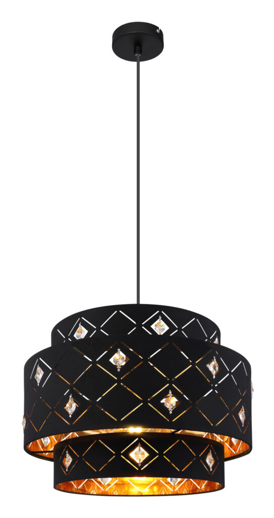 Függeszték fém fekete váz, fekete-arany textil ernyővel, akril -kristály