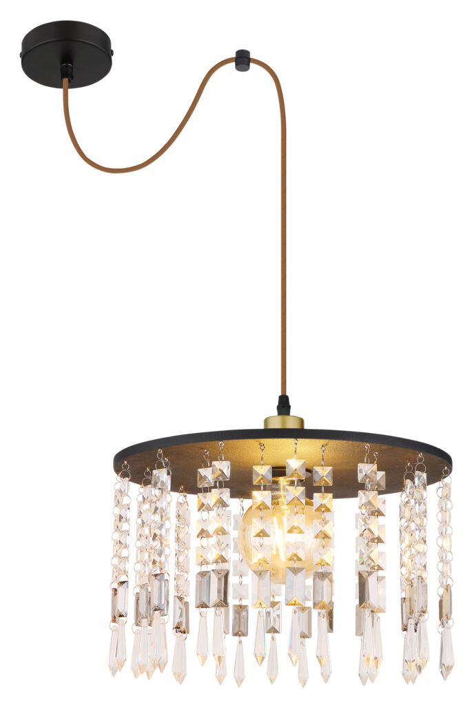 Függeszték lámpa matt sárgaréz fekete fa üvegkristályok barna textil