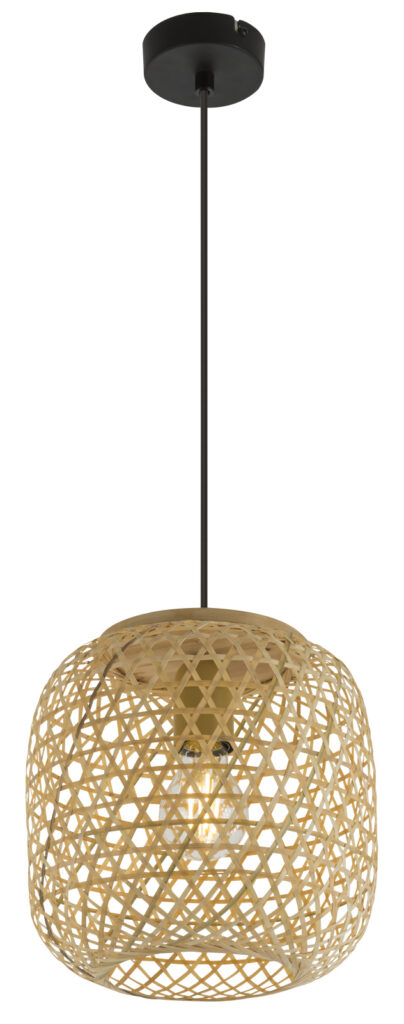 Függeszték natúr bambuszból szőtt búra, fekete textilkábelen lógatva.