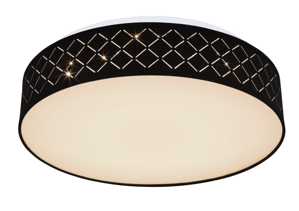 Mennyezeti lámpa fekete textil búra bemarásokkal, fehér akril fedőlap.