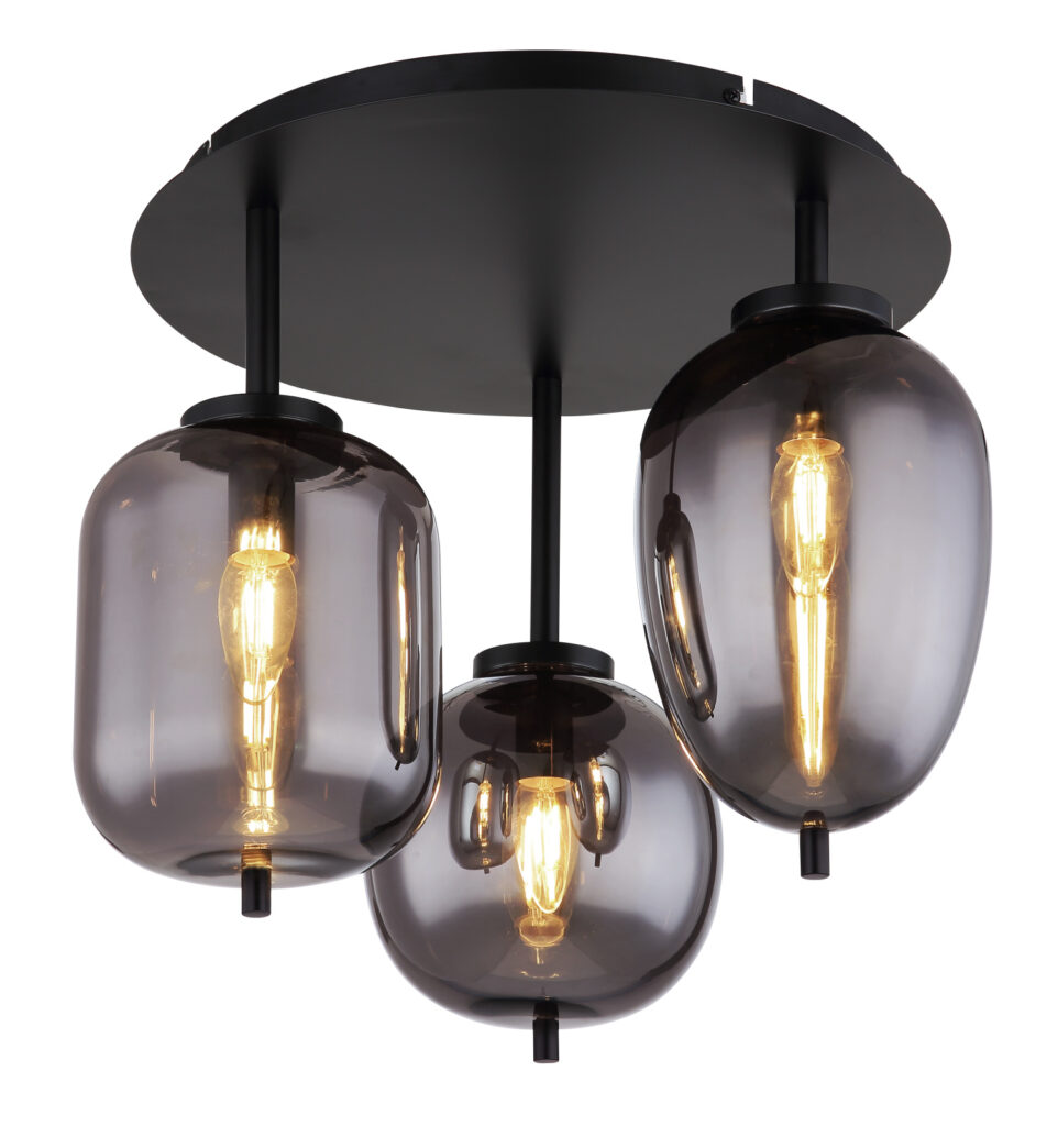Mennyezeti lámpa fém matt fekete füstszínű üveg 3 eltérő alakú üveg