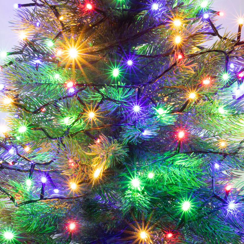 Xmas LED-es beltéri fényfüzér, 16m / 200db színes LED, állófényű, zöld vezeték, hálózati adapter