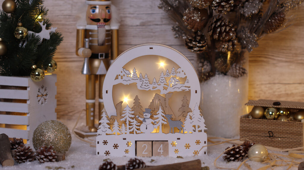 Xmas LED karácsonyi kocka naptár tájkép, fa, elemes